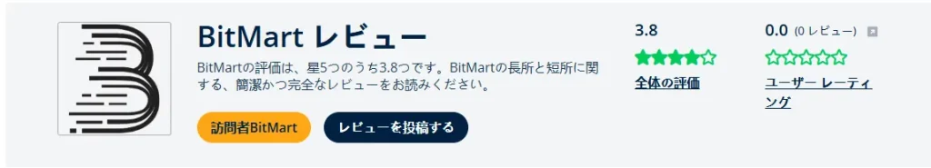 上記の画像はBitMartのレビュー評価です。全体の評価が3.8となっています。