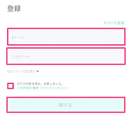 入力後は「利用規約とプライバシーポリシー」にチェックを入れて「続ける」をクリックします。