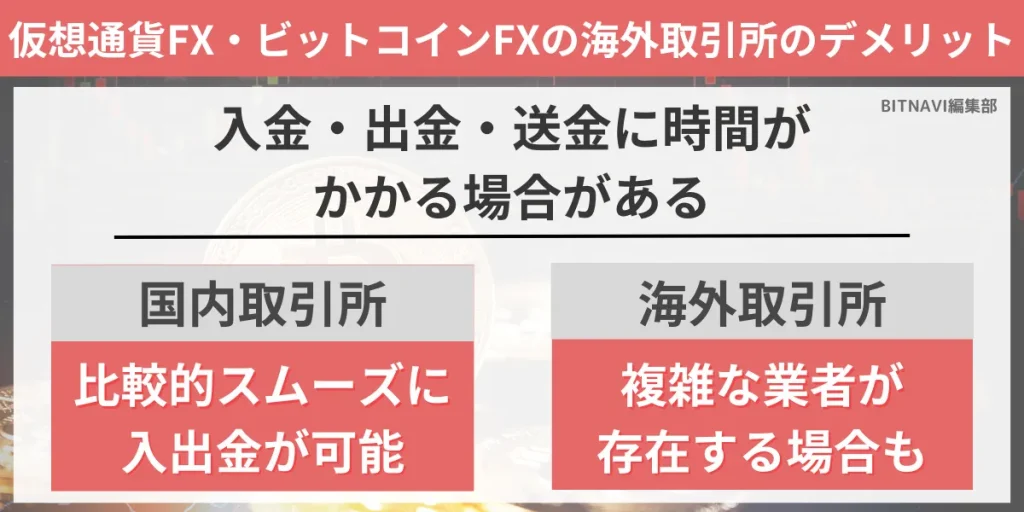 海外業者はハイレバレッジで仮想通貨FX(ビットコインFX)が行えるため、儲けることは不可能ではありませんが、同時にリスクも伴うため注意が必要です。
