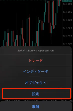 まず、チャート画面をタップし「トレード」を選択します。